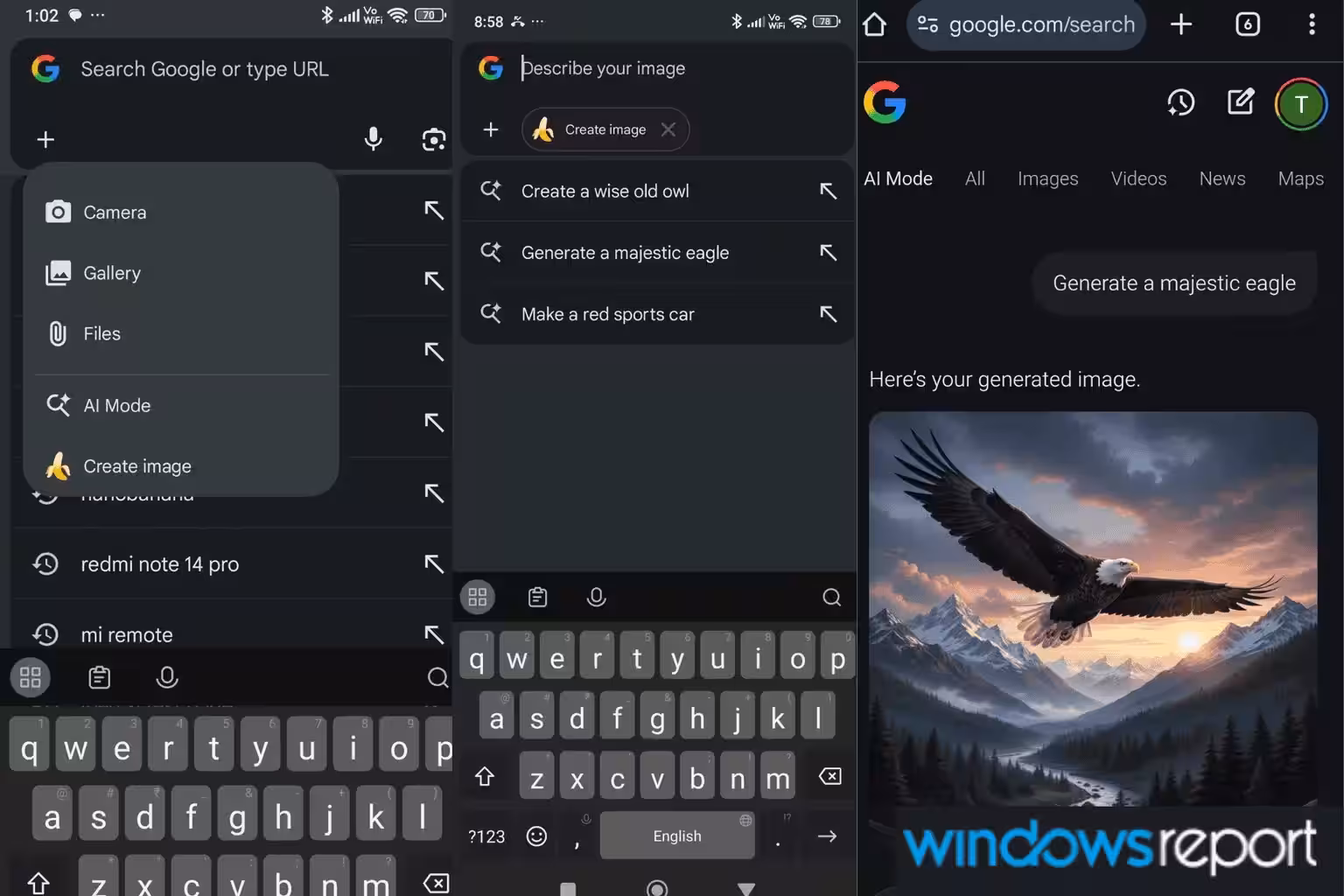 Чтобы вызвать функцию на смартфоне, нужно открыть адресную строку и нажать кнопку с плюсом. Появится меню с пунктами «Камера», «Галерея», «Файлы», «AI Mode» и «Создать изображение». При выборе последнего под адресной строкой появляется чип, куда можно ввести текстовый запрос. После этого Nano Banana создаёт изображение прямо в браузере.