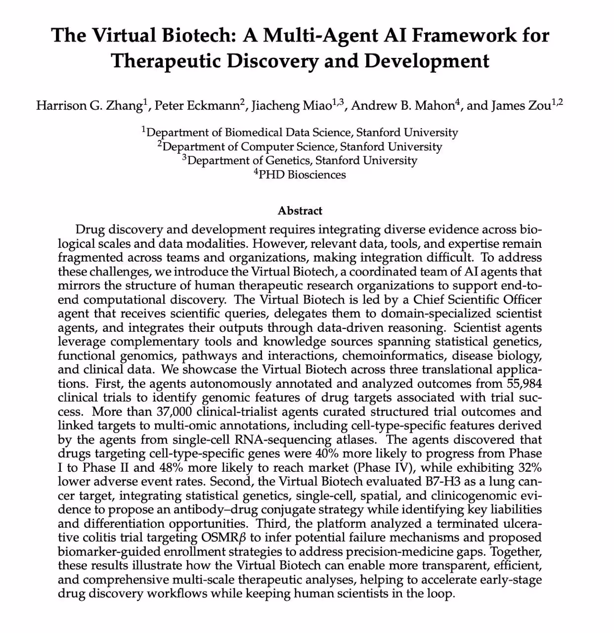 Группа исследователей из Стэнфорда и PHD Biosciences создала искусственный интеллект под названием Virtual Biotech — мультиагентную систему, имитирующую структуру фармацевтических компаний, способную анализировать и предсказывать успех клинических испытаний лекарств. Этот проект обработал данные 55 984 испытаний разных фаз, чтобы понять, почему одни препараты доходят до рынка, а другие терпят неудачу.