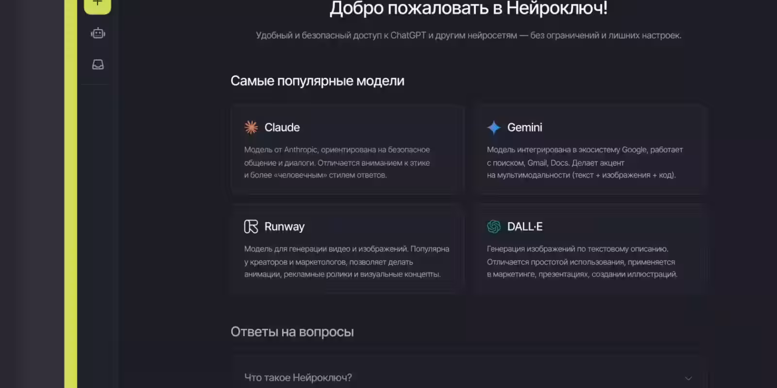 «Нейроключ» обеспечивает работу с любыми моделями искусственного интеллекта: GPT, Claude, решениями с открытым кодом и кастомными разработками. В платформу встроены панель администрирования, система управления пользователями и лимитами, а также мониторинг использования.