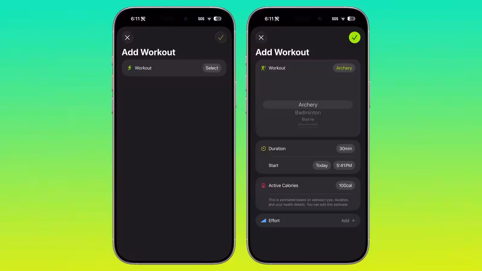 На iPhone стало возможно создавать собственные тренировки прямо в Fitness. Пользователь может задать тип активности, предполагаемое количество активных калорий, уровень усилия, длительность и время начала. Это делает приложение более гибким для тех, кто тренируется по индивидуальным программам.