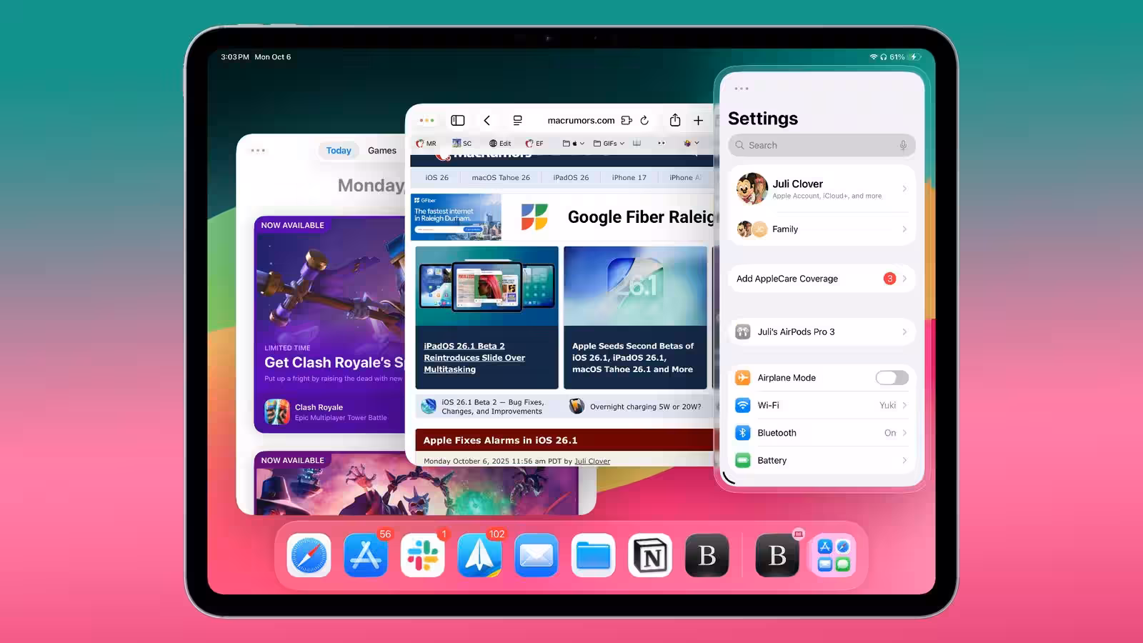 Вторая бета iPadOS 26.1 вернула функцию Slide Over. Теперь её можно использовать вместе с оконным режимом многозадачности iPadOS 26. Пользователь может открыть несколько окон и при этом быстро вызвать дополнительное приложение в режиме Slide Over.