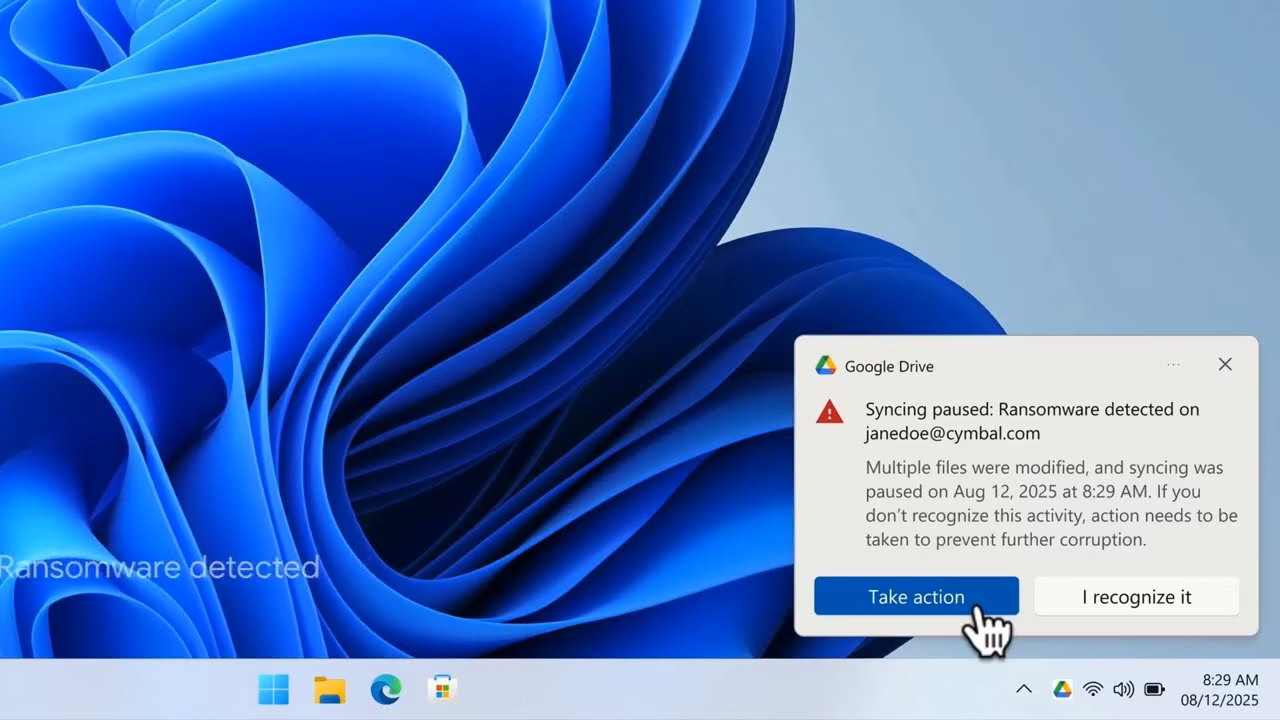 Система работает через Drive for desktop. Если ИИ замечает попытку зашифровать файлы, синхронизация приостанавливается, чтобы испорченные версии не успели перезаписать чистые копии в облаке. Пользователь и администратор получают уведомление сразу, без вежливых церемоний и с очень понятным смыслом: что-то пошло не так.