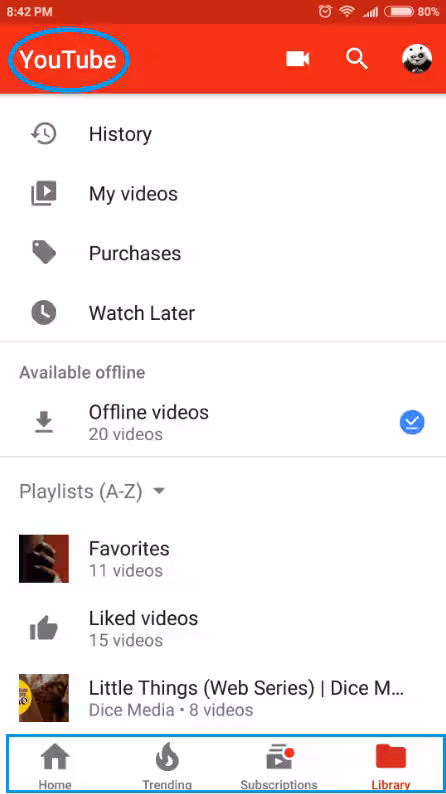 Другое изменение — это новая схема навигации, которая предлагает ссылки на Home, Trending, Subscriptions и Library. Кнопка загрузки видео была перемещена влево от строки поиска, а в верхнем левом углу теперь отображается название «YouTube» вместо названия вкладки, которую вы используете.