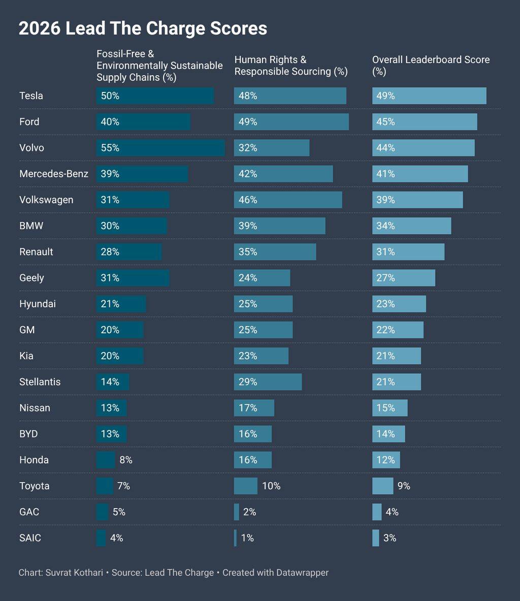 Новое исследование «Lead The Charge» выявило, кто из крупнейших автопроизводителей действительно продвинулся в снижении углеродного следа производства электромобилей и налаживании ответственного добывания материалов для батарей. Первенство занял Tesla, за ней следуют Ford и Volvo. При этом в среднем по 18 компаниям уровень минимизации выбросов и улучшения условий труда в цепочках поставок остаётся на скромных 24%, несмотря на положительную динамику в 5% за год.