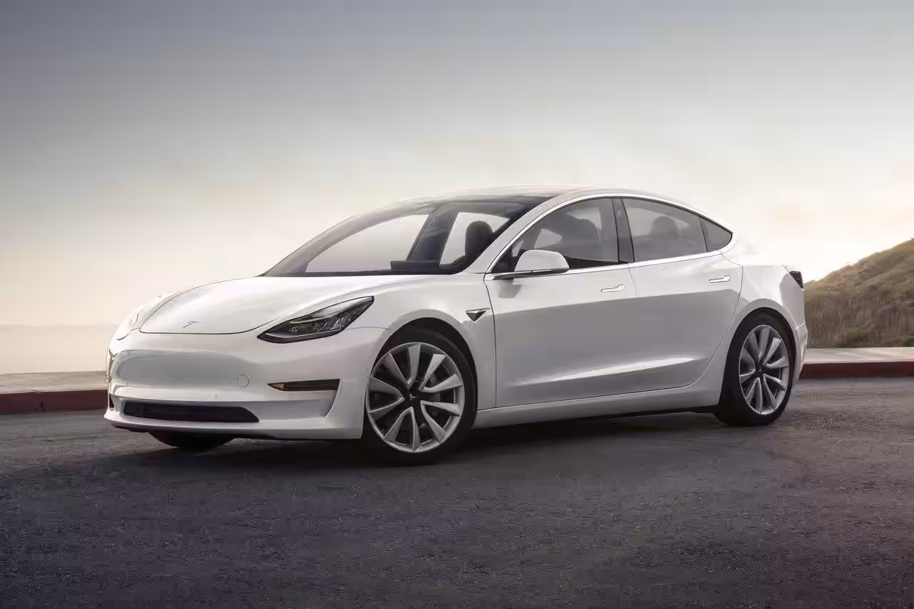 Белый электромобиль Tesla Model 3 сбоку на дороге