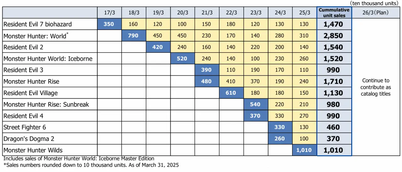 В течение года игровое подразделение Capcom реализовало 51,87 млн копий своих игр, что на 5 млн больше, чем в прошлом году. Существенную роль сыграл релиз Monster Hunter Wilds, который разошёлся тиражом свыше 10 млн экземпляров за первый месяц. Также активно продавались игры из уже существующего каталога, включая серию Monster Hunter.