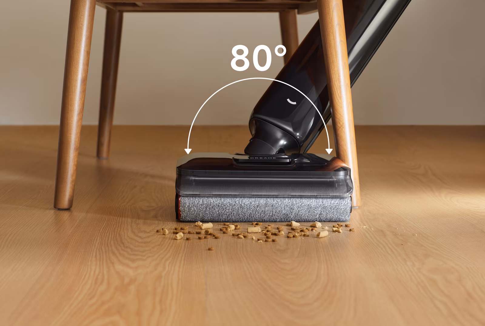 Высота корпуса составляет 9,85 см, а шарнир позволяет отклонять ручку на 80°, что упрощает уборку вдоль стен и в узких проходах. Вес 4,7 кг с центром тяжести, смещённым к основанию, снижает нагрузку на запястье при длительной работе.