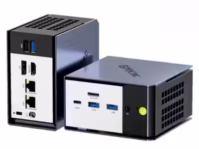 На передней панели расположены кнопка питания, два порта USB 3.2 Gen 2, порт USB4 Type-C, 3,5-мм аудиоразъём и разъём OCuLink. Сзади находятся ещё два порта USB 3.2 Gen 2, HDMI, DisplayPort, два сетевых порта 2.5GbE и разъём питания. Система поддерживает одновременное подключение до трёх дисплеев.