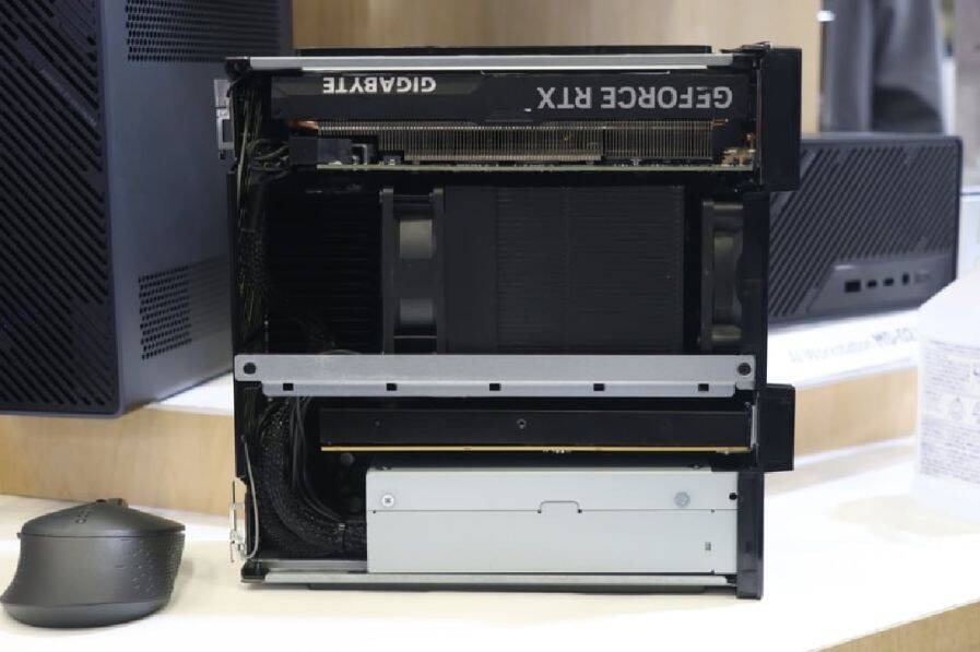 Основой мини-ПК является топовый 24-ядерный процессор Core Ultra 9 285HX. Предусмотрена возможность установки дискретного графического адаптера, занимающего до двух слотов расширения, например, GeForce RTX 5060 Low Profile или RTX 4000 SFF Ada. Для этой цели на материнской плате расположен слот PCIe 5.0 x16.