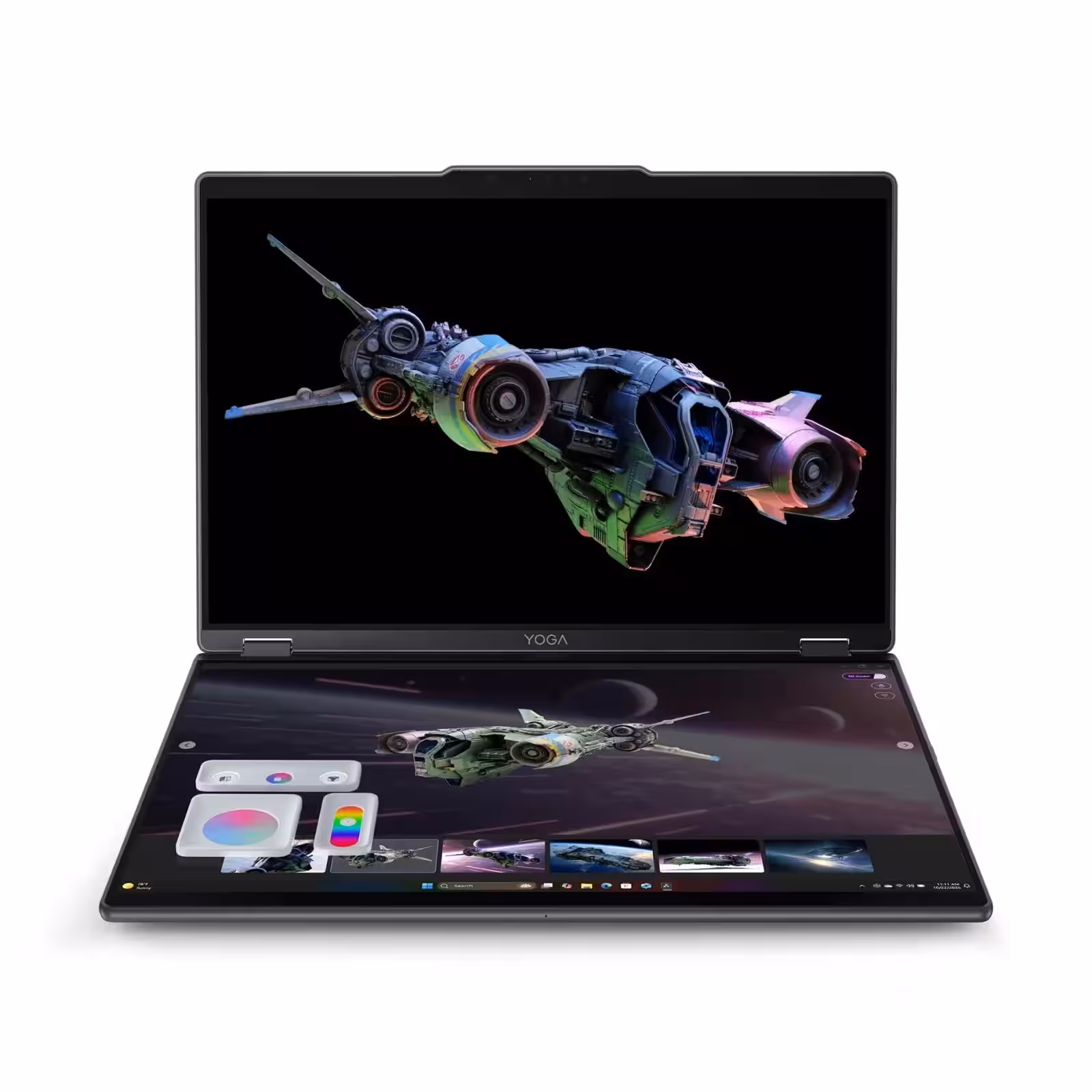 Новинка напоминает доработанную версию существующих двухэкранных моделей, таких как Yoga Book 9i. Устройство оснащено двумя OLED-дисплеями и камерой высокого разрешения для отслеживания движений в 3D-пространстве.