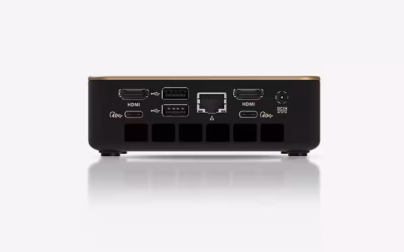 На передней панели размещены два порта USB 3.2 Gen 2 Type-A, аудиоразъём и кнопка питания с LED-индикатором. Задняя панель включает два HDMI 2.1, два USB 4.0 Type-C с поддержкой Power Delivery 3.0, один USB 3.2 Gen 2 Type-A, один USB 2.0 Type-A, сетевой порт RJ45 (2.5G) и разъём питания.