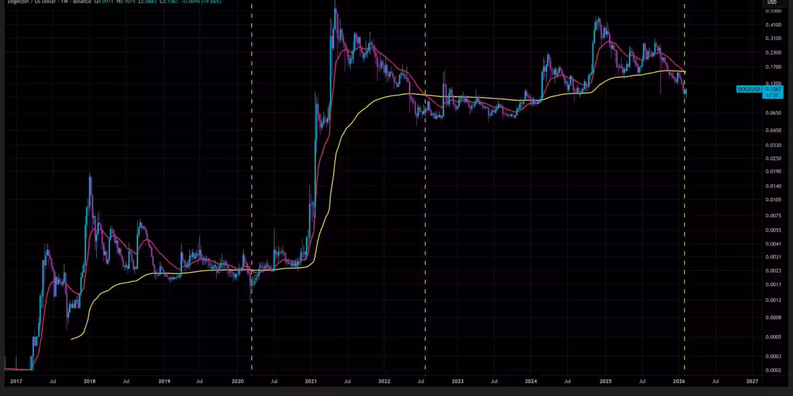 Dogecoin на недельном графике отработал редкий «медвежий крест»: 20‑недельная EMA пересекла вниз 200‑недельную EMA. Трейдеры спорят, был ли тест $0.08 прошлой недели точкой перезагрузки цикла или только первой фазой снижения — и от ответа зависит не только судьба DOGE, но и оценка аппетита к риску через призму мемкойнов.