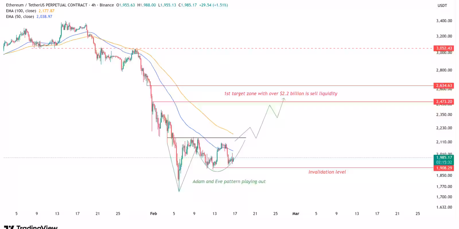 На четырёхчасовом графике складывается паттерн Adam and Eve: резкое V‑образное падение, за которым следует более округлая база. Подтверждение паттерна — закрытие выше шеи на $2,150; в этом случае по измерению движения целевой диапазон смотрится в $2,473-$2,634. Инвалидация — ниже недавних локальных минимумов, ближайший «магнит» ликвидности — $1,909.