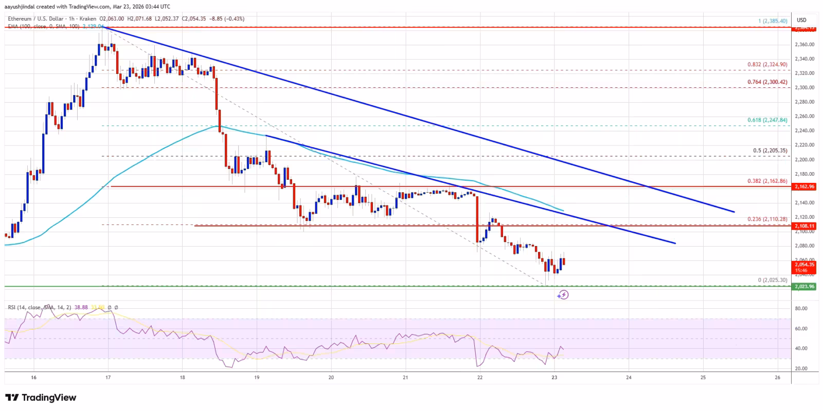 Цена Ethereum резко упала ниже уровня $2 220 и сейчас консолидируется чуть выше $2 020, пытаясь сформировать базу для возможного отскока. Пара ETH/USD торгуется ниже $2 120 и 100-часовой скользящей средней, при этом на часовом графике сформировались две медвежьи трендовые линии с сопротивлением на $2 120 и $2 165. Эти уровни сдерживают рост Ethereum и сохраняют давление на рынок.