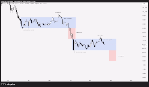 Этот цикл уже проявлялся с ноября 2025 по январь 2026, когда цена колебалась между $85 000 и $92 000, после чего неудачно пробила верхний уровень и упала до $63 000. Сейчас схожий процесс происходит в диапазоне от $63 000 до $72 000. Аналитики прогнозируют повторение этого сценария. Неудачная попытка закрепиться выше $76 000 в начале марта усиливает ожидания падения.