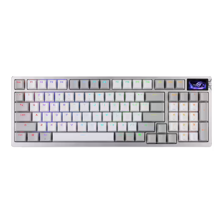 В Azoth 96 HE также встроен полноцветный сенсорный экран диагональю 1.47 дюйма и трёхпозиционный регулятор, позволяющий быстро менять параметры вроде чувствительности или глубины срабатывания. Конструкция с четырьмя слоями PORON, одной прокладкой IXPE и силиконовой подложкой снижает вибрации и шум клавиш. Верхняя панель выполнена из металла, а полупрозрачные клавиши с символикой ROG придают устройству премиальный вид.