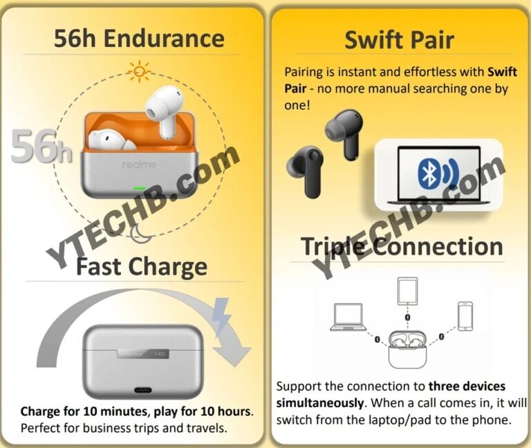 Наушники получили 12,4 мм динамические драйверы с поддержкой Spatial 360, активное шумоподавление до 50 dB и охватом частот до 5 000 Гц. Для разговоров заявлена шестимикрофонная система с AI‑шумоподавлением; управление звуком и эквалайзером — через приложение Realme Link.