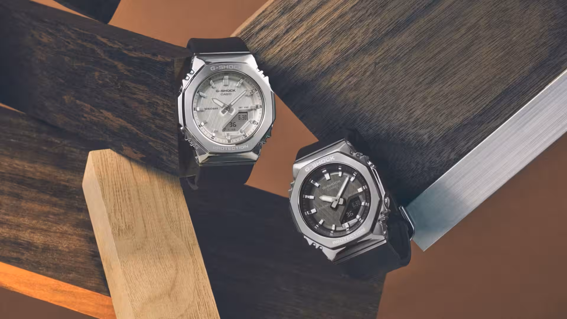 Обе модели оснащены восьмигранным безелем из нержавеющей стали, что сразу делает внешний вид более строгим и премиальным, по сравнению с версиями из обычного пластика. Однако главный акцент — циферблат. Casio использует тонкий узор в виде перекрёстной штриховки, который деликатно отражает свет и создаёт ощущение металлической поверхности, даже несмотря на то, что сам циферблат не металлический. Небольшая деталь, но она делает часы визуально дороже.