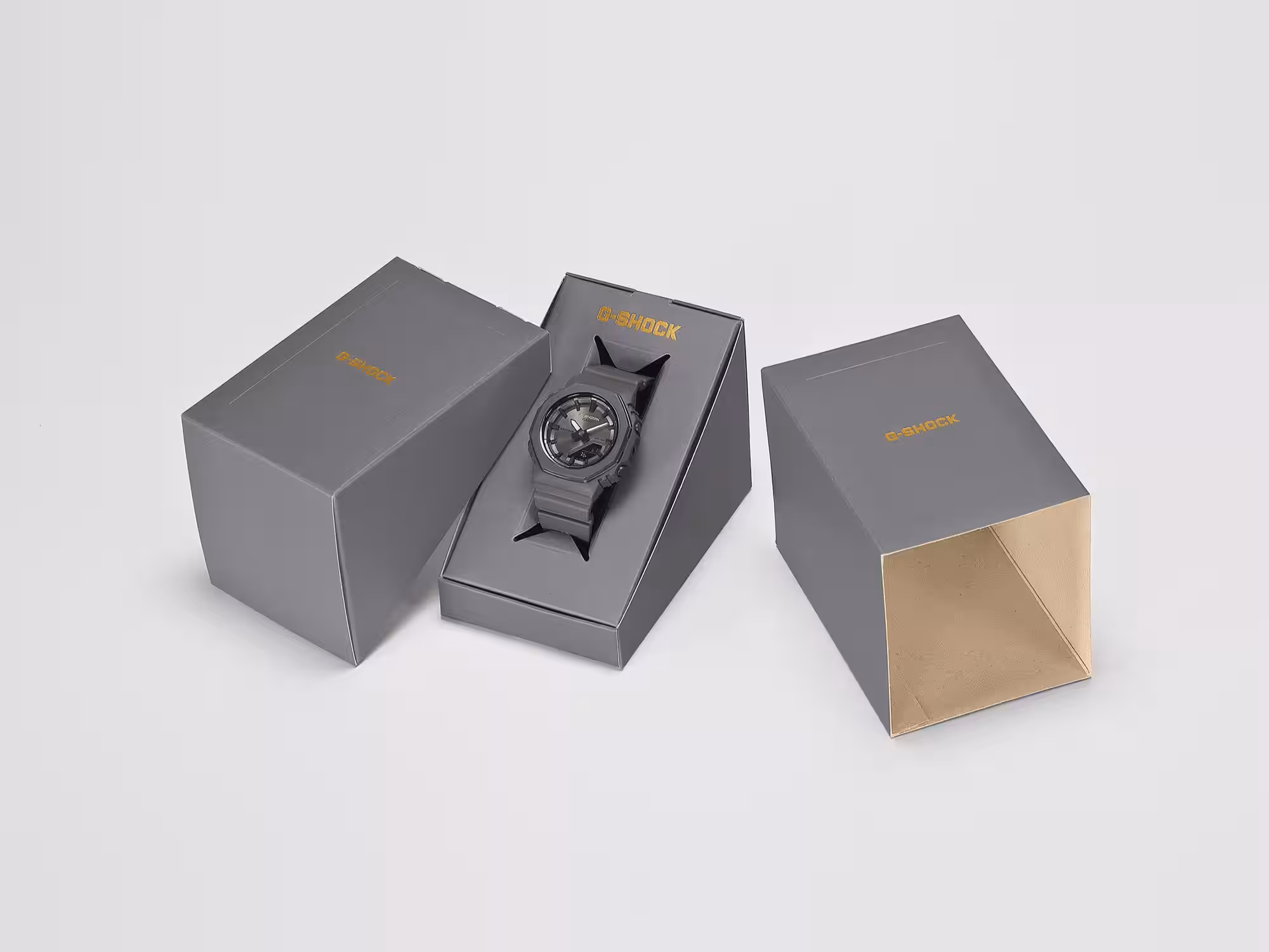 Часы сохраняют компактный дизайн серии GMA-P2110 с металлическим безелем-кольцом и выполнены в тёмно-серой монохромной цветовой гамме. Циферблат металлического серого оттенка получил радиальную шлифовку и золотистые акценты на концах часовых меток.