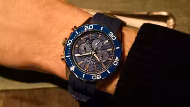 Новая модель дополняет линейку спортивных часов среднего размера и заметно отличается от недавно представленных авиационных хронографов бренда. Вместо пилотского стиля Citizen сделала ставку на более современный «интегрированный» дизайн. Корпус из нержавеющей стали с розово-золотым покрытием сочетается с синим циферблатом, украшенным горизонтальным волнообразным узором. Такой фон создаёт высокий контраст с метками и стрелками в цвете розового золота, что положительно сказывается на читаемости, несмотря на сложную компоновку с тремя субциферблатами.