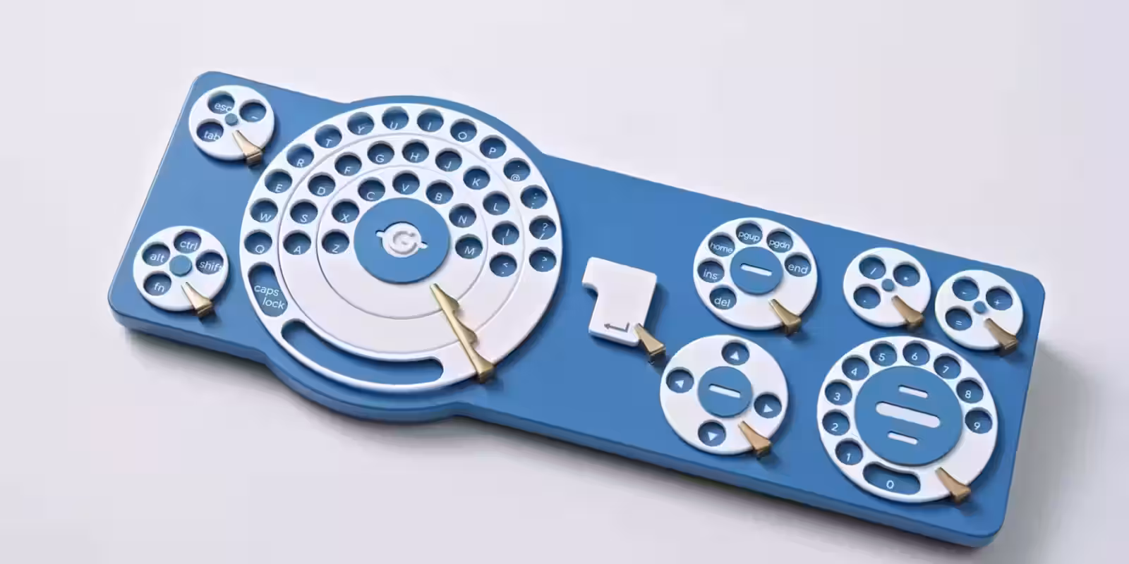 Вместо стандартных клавиш здесь используются вращающиеся диски: пользователь помещает палец в отверстие и вращает диск до тех пор, пока не найдет нужную букву. По утверждению разработчиков, такой подход исключает случайные нажатия, а ввод сопровождается характерными щелчками и временем «возврата», которое, по ироничному замечанию Google, помогает обдумать следующую букву.