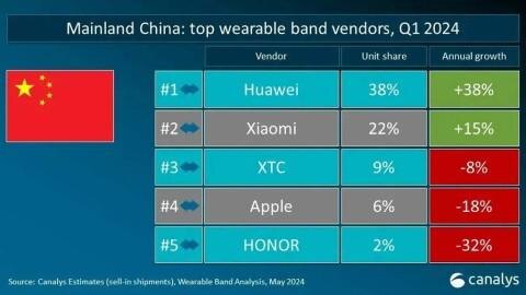 В Китае Huawei также лидирует по объемам продаж и темпам роста — оба показателя составляют 38%. Xiaomi показал рост в 22% и 15% соответственно. Тройку лидеров замыкает бренд XTC, который поставил 9% от общего объема смарт-часов. Apple и Honor, занимающие пятое место, продали в Китае меньше устройств в первом квартале 2024 года, чем в прошлом году (на 18% и 31% соответственно).