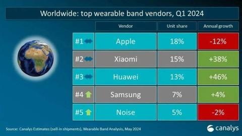 Samsung занимает четвертое место в мировом рейтинге с долей рынка 7% и ростом на 4%. Пятую позицию занимает индийский бренд Noise.