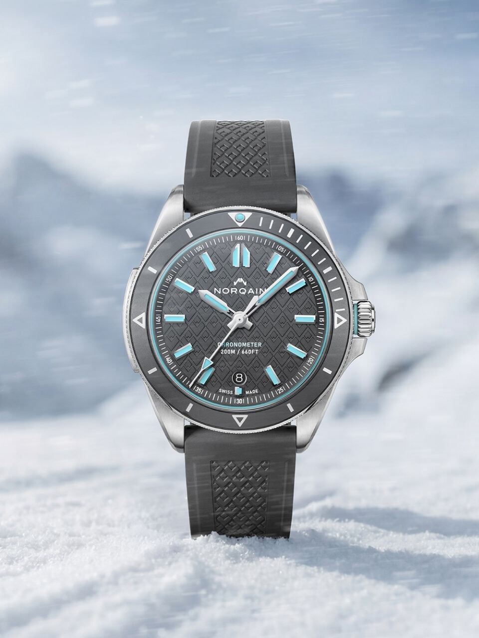 Швейцарская Norqain представила две версии модели Adventure с корпусом 40 мм и фирменным горным узором на циферблатах, которые подчёркивают связь с альпийскими пейзажами. Циферблаты выполнены в сером и зелёном цветах, а одна из версий, NeVereST 40 мм, дополнена оранжевыми акцентами, делающими дизайн ярче и динамичнее.