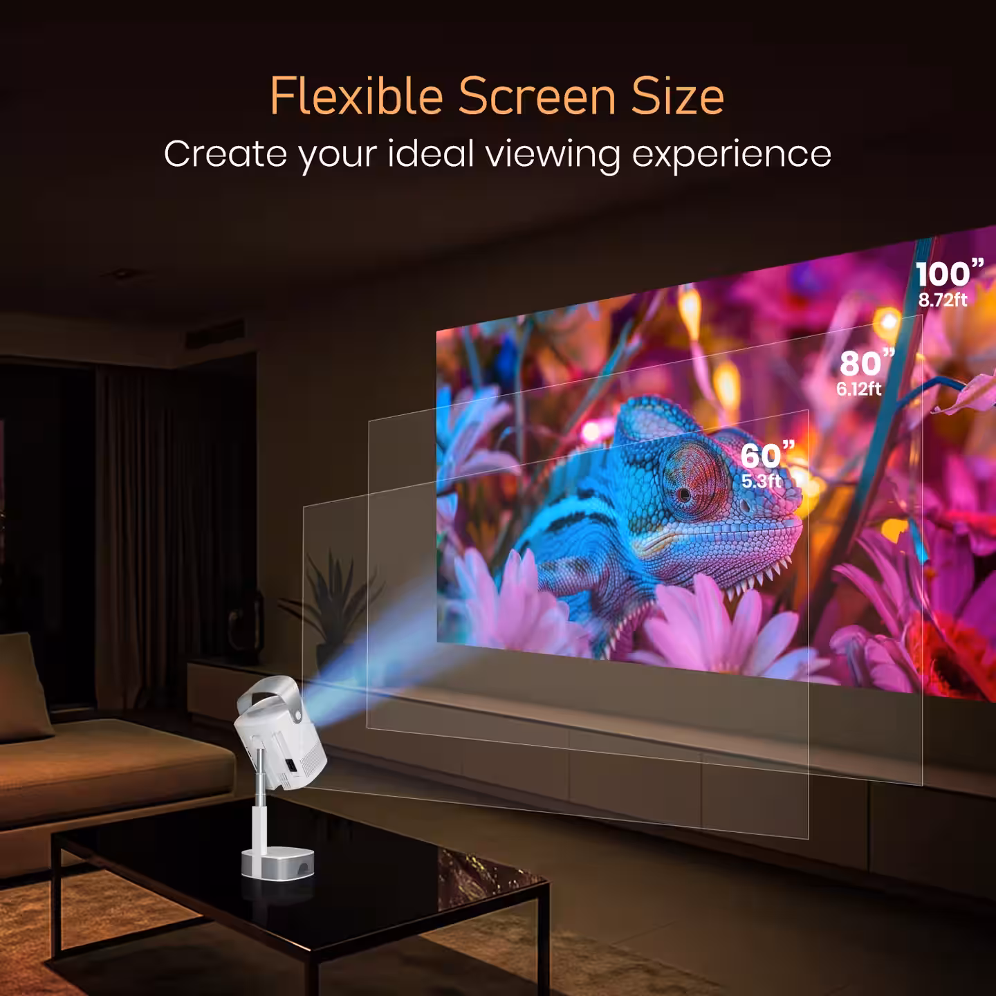 Проектор оснащён системой автофокуса и автоматической коррекцией трапецеидальных искажений, что избавляет пользователя от ручной настройки изображения. Встроенный телескопический монопод позволяет регулировать высоту и угол наклона, так что устройство можно установить на стол или пол без дополнительных аксессуаров.