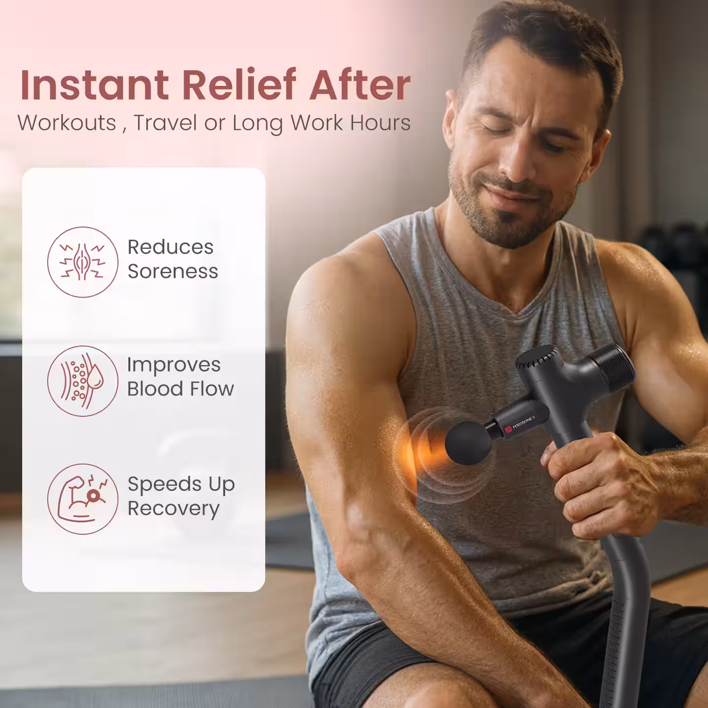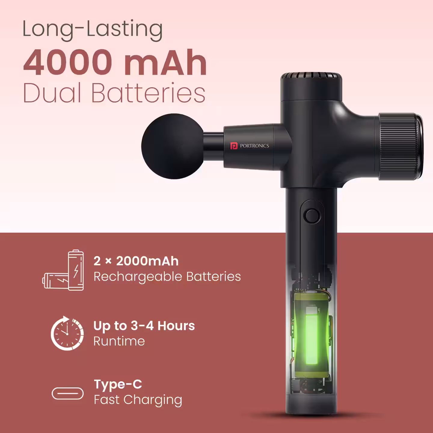 Одной из ключевых особенностей устройства стала удлиненная изогнутая эргономичная ручка. Благодаря ей пользователь может самостоятельно прорабатывать спину, плечи и ноги без посторонней помощи. Таким образом, Portronics решает распространенную проблему компактных массажеров с короткими ручками, которые ограничивают удобство использования.
