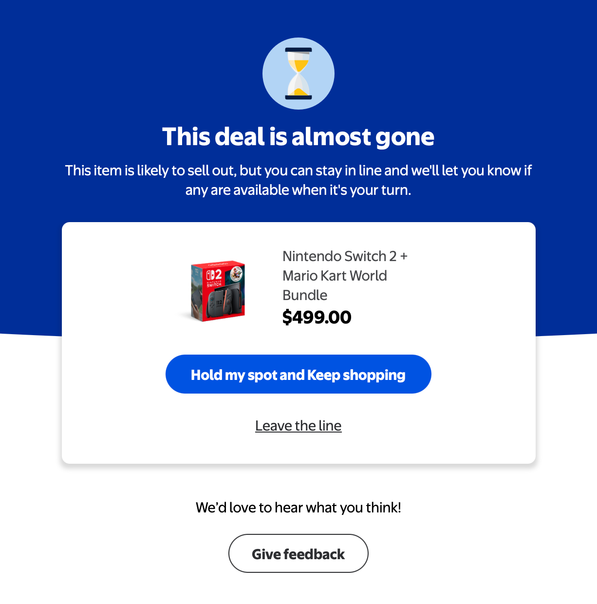 На сайте Walmart включилась «смутная очередь» — по словам очевидцев, страница лишь выдавала сообщение «Сделка почти завершена», не давая чёткой информации о доступности товара. В то же время популярный обозреватель скидок Wario64 написал в X (Twitter) в 00:20 по восточному времени, что «ещё не поздно», и консоли всё ещё можно найти в наличии в Target и Walmart.