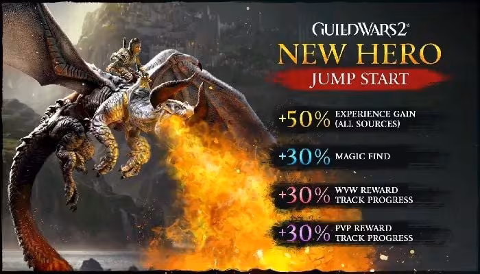 При создании нового персонажа в этот период вы автоматически получаете эффект New Hero Jump Start Boost. Он добавляет +50% опыта со всех источников, +30% к шансу найти магическую добычу, а также +30% к прогрессу на наградных треках в World vs World и PvP. Эти бонусы действуют всё время события, предоставляя отличный шанс быстро развиваться и получать редкие предметы.