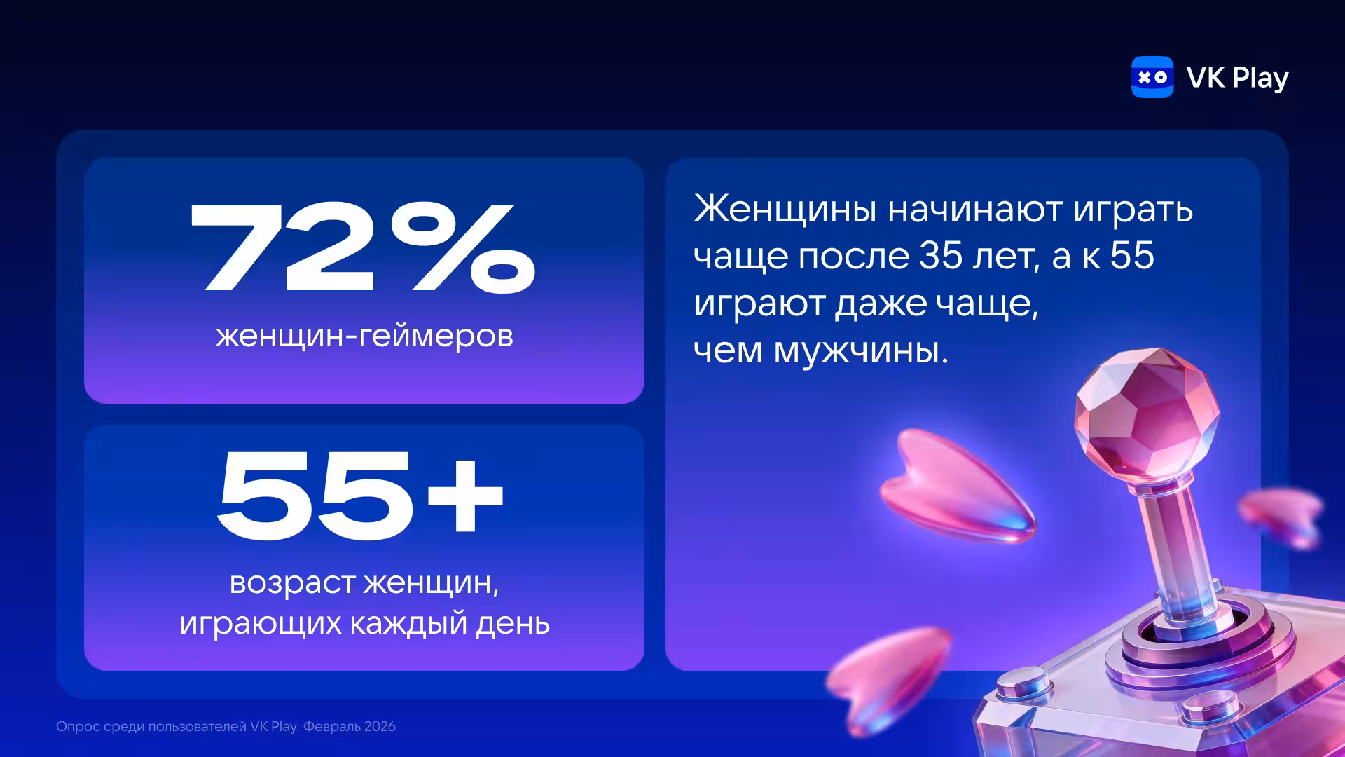VK Play представила результаты опроса более 5 400 игроков, которые опровергают классические представления о женщине-геймере. Согласно исследованию, вовлечённость женщин в игры растёт с возрастом: после 35 лет они играют чаще и активнее многих мужчин. Особенно примечателен факт, что среди геймерш старше 55 лет ежедневная игра становится привычкой для 72%, что выше, чем у их ровесников-мужчин.