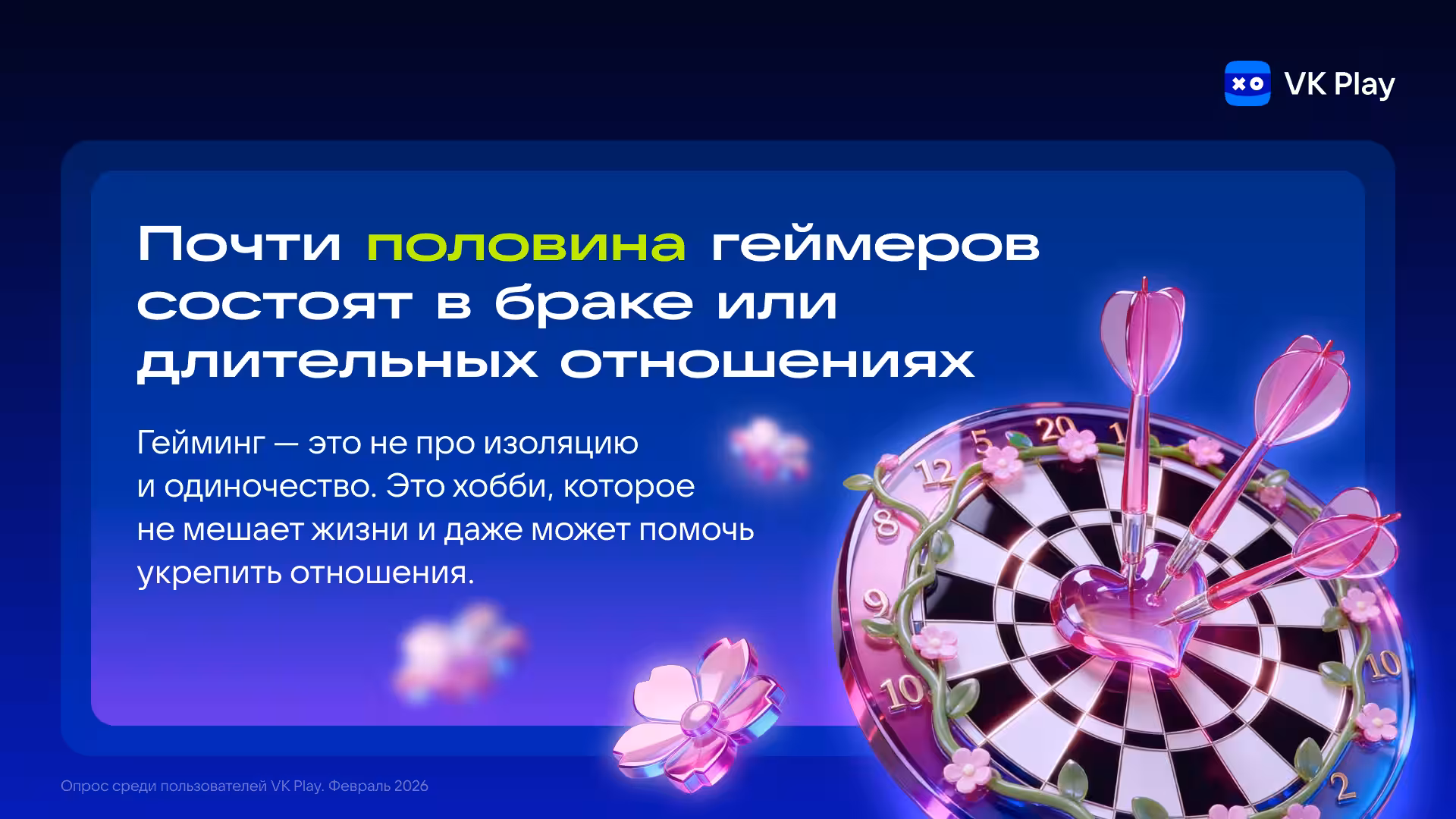 Гейминг давно перестал быть тусовкой одиночек. В выборке почти половина игроков состоят в стабильных отношениях, при этом 60% девушек-геймеров включают игровое хобби в анкеты для знакомств, стараясь найти партнёра с похожими интересами. Для трети женщин это — автоматический фильтр: с несхожими увлечениями общение прекращается. Значительная часть респондентов отмечает, что игры помогают начать разговор и сблизиться.