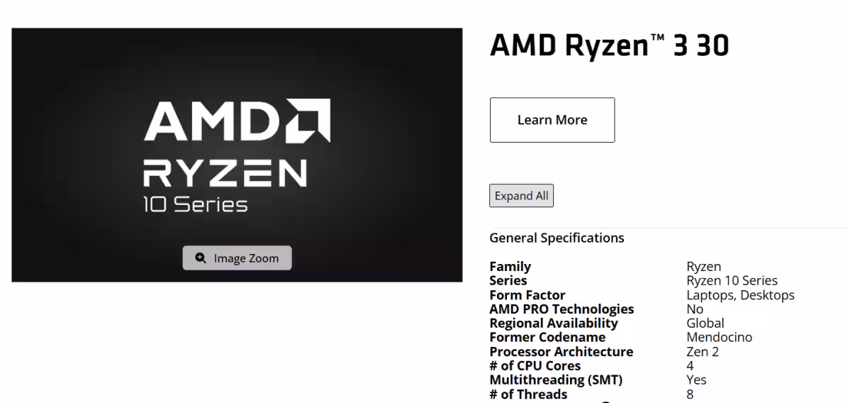 Линейка Ryzen 10 включает всего два CPU на базе архитектуры Zen 2: это четырехъядерные Ryzen 3 30 и Ryzen 3 40, интегрированные с графикой Radeon 610M. Их предшественниками являются Ryzen 3 7320U и Ryzen 5 7520U соответственно.