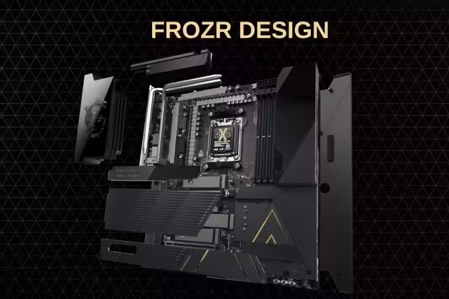 Для эффективного охлаждения MSI реализовала сложную систему отвода тепла: магнитный M.2 Frost Armor второго поколения, массивные радиаторы с плотным оребрением, крестообразные тепловые трубки и полное покрытие зон VRM, чипсета и накопителей.