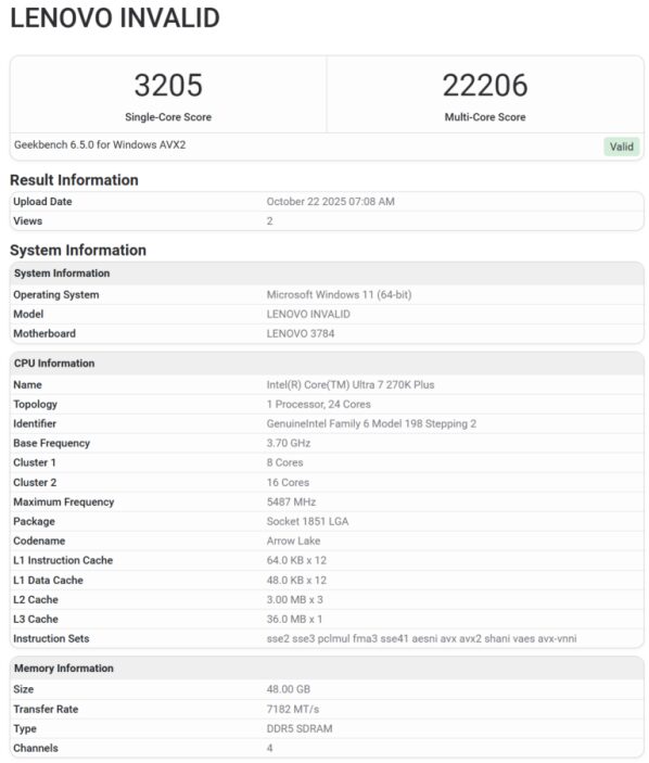 Информация из Geekbench указывает, что Core Ultra 7 270K Plus будет иметь 8 высокопроизводительных ядер и 16 энергоэффективных, так же, как и Core Ultra 9 285K. Начальная частота процессора заявлена на уровне 3,7 ГГц, с возможностью повышения до 5,5 ГГц в турбо-режиме.
