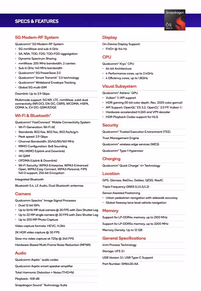 Snapdragon 6s Gen 4 (SM6435-AA) изготавливается по 4-нм техпроцессу Samsung. Компания заявляет о 36-процентном росте производительности процессора и 59-процентном увеличении мощности графического ускорителя. Процессор Kryo состоит из четырёх производительных ядер с частотой до 2,4 ГГц и четырёх энергоэффективных ядер с частотой 1,8 ГГц.