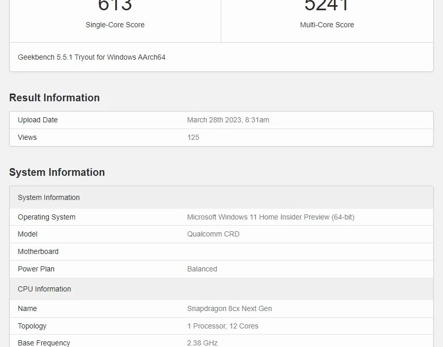 Тесты были проведены в операционной системе Windows 11 с режимом питания, установленным на «сбалансированный». Однако, судя по результатам тестирования, пока что производительность нового процессора не впечатляет: он показал 613 баллов в одноядерном и 5241 балл в многоядерном тестах, что хуже, чем у Snapdragon 8cx Gen 3.