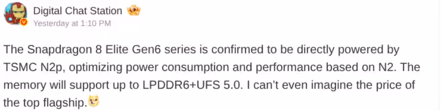 Qualcomm готовит первый 2-нм чипсет Snapdragon 8 Elite Gen 6, который дебютирует в конце 2026 года. Новинка перейдёт на память LPDDR6 и накопители стандарта UFS 5.0, обеспечив рост производительности и энергоэффективности, но и подорожание флагманов.
