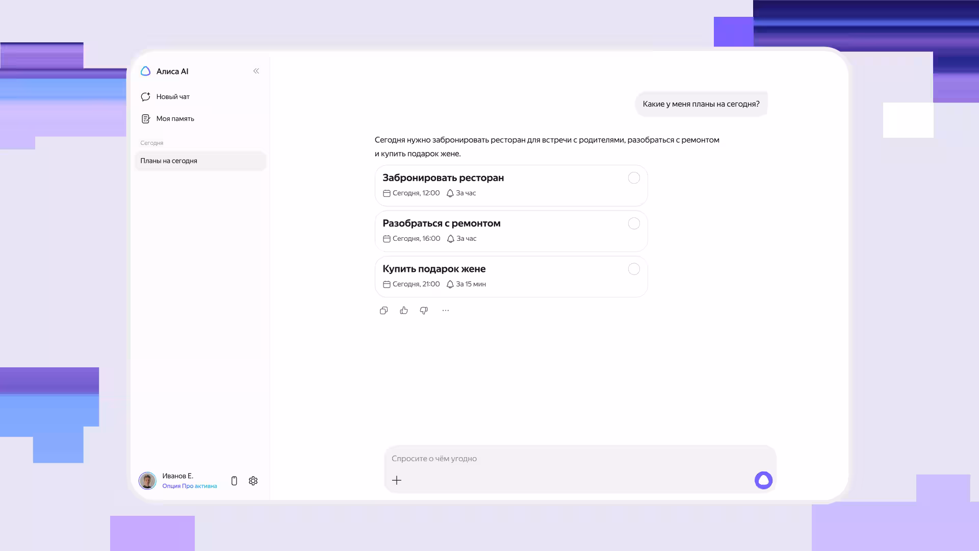 Раздел «Моя память» создаётся как цифровой органайзер. Алиса AI сможет превращать поток мыслей пользователя в структурированные заметки, списки покупок и напоминания. Достаточно просто сказать «Алиса, напомни позвонить вечером» — ассистент запомнит фразу, привяжет её ко времени и уведомит.