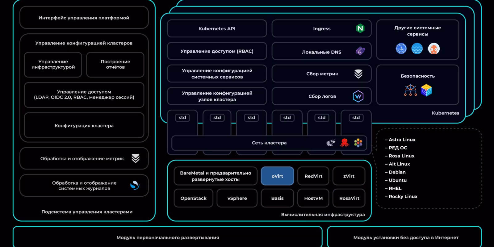 «Штурвал. Кубербокс» — это та же enterprise-редакция платформы, только с официально подтверждённым уровнем защиты. Функциональность не урезана: заказчики получают полный набор инструментов для построения корпоративных облачных сред, разработки и эксплуатации микросервисных приложений.