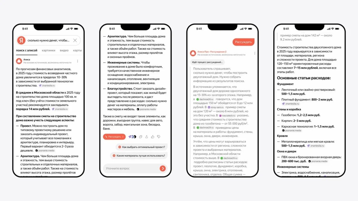 Режим рассуждений станет полезным инструментом для более глубокого изучения тем, например, для оценки стоимости строительства двухэтажного дома и учета всех факторов при составлении сметы. В этом режиме «Алиса» анализирует больше информации, использует больше источников и представляет ответ в удобном для восприятия виде, например, в виде сравнительной таблицы. Пользователи могут проследить ход ее размышлений и оценить сделанные выводы. Активировать режим рассуждений можно, нажав кнопку «Рассуждать» под ответом «Алисы».