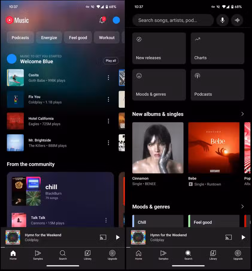 Сервис YouTube Music работает уже 10 лет и за это время стал одним из популярных музыкальных приложений. Новое обновление меняет интерфейс: поиск перемещён вниз, рядом с другими основными вкладками.