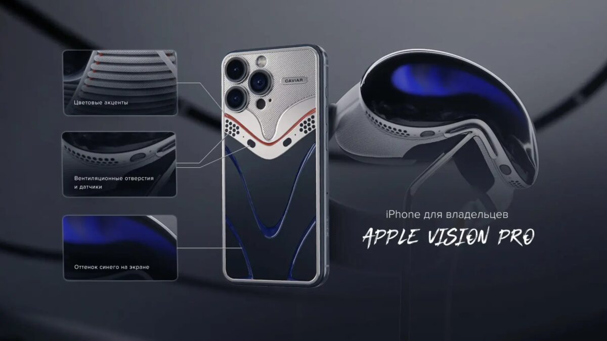 На задней стороне iPhone 15 Pro можно увидеть элементы гарнитуры Vision Pro. Например, имитация нижней панели устройства с повторяющимся рисунком динамиков и другими узнаваемыми элементами. Также присутствуют характерные плавные линии гарнитуры, фактура и отличительные цветовые акценты, включая яркую оранжевую вставку.