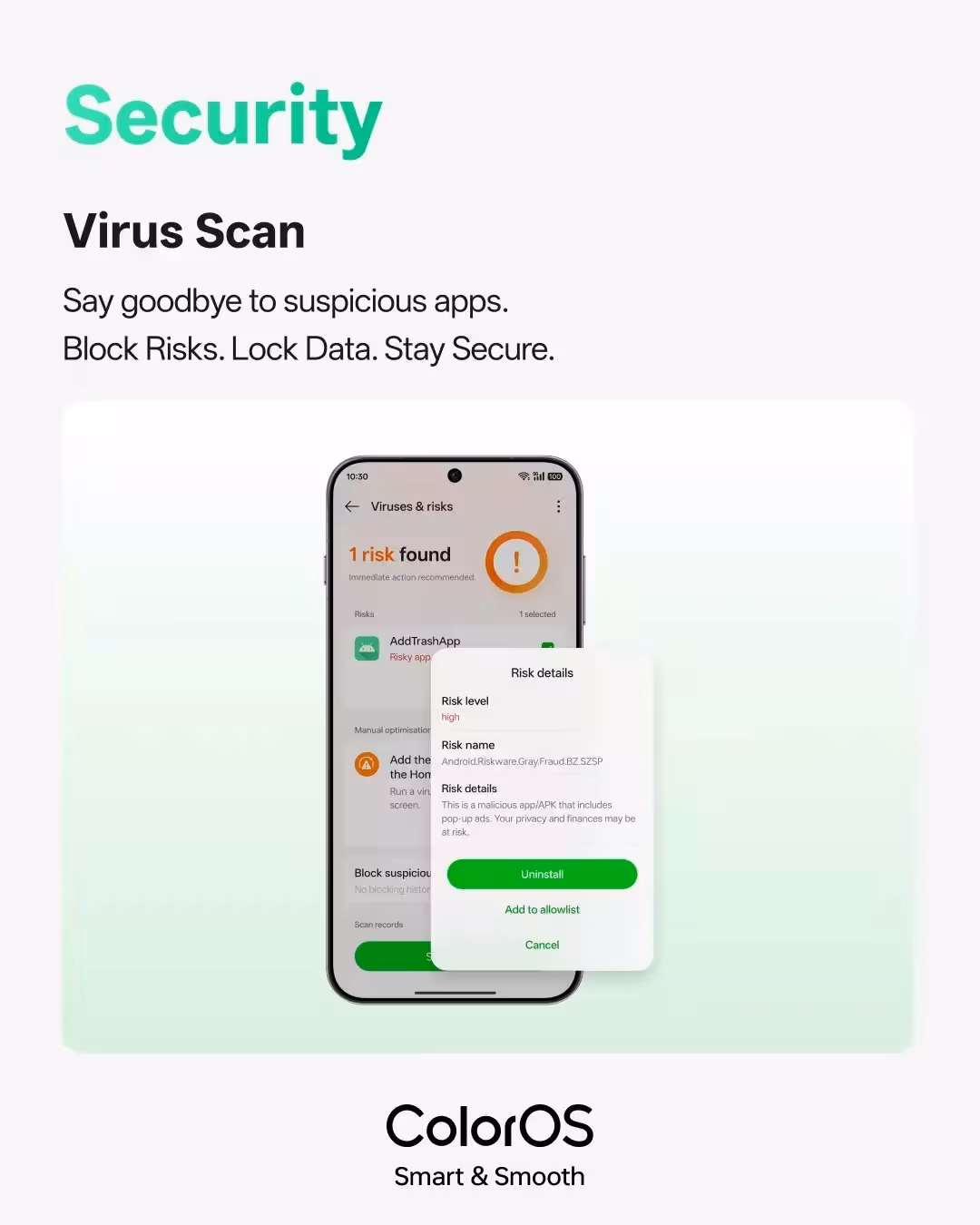 Главное нововведение ColorOS 16 — расширенный встроенный сканер вирусов. Он автоматически выявляет потенциально опасные приложения, оценивает уровень угрозы и предлагает удалить их прямо из окна сканера. Теперь искать вредоносные APK или приложения с навязчивой рекламой вручную через настройки не нужно. OPPO встроила базовую антивирусную защиту на системном уровне, что особенно важно с учётом растущей сложности угроз безопасности.