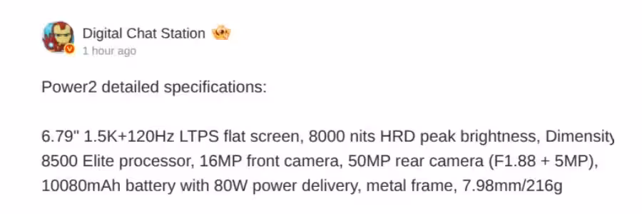 В качестве процессора, предположительно, используется MediaTek Dimensity 8500 Elite. Фронтальная камера имеет разрешение 16 Мп, а основная камера представлена двойным модулем: главным сенсором на 50 Мп с диафрагмой f/1.88 и дополнительной 5-мегапиксельной камерой. Информации о размере сенсора и возможностях видеосъёмки источник не раскрыл.