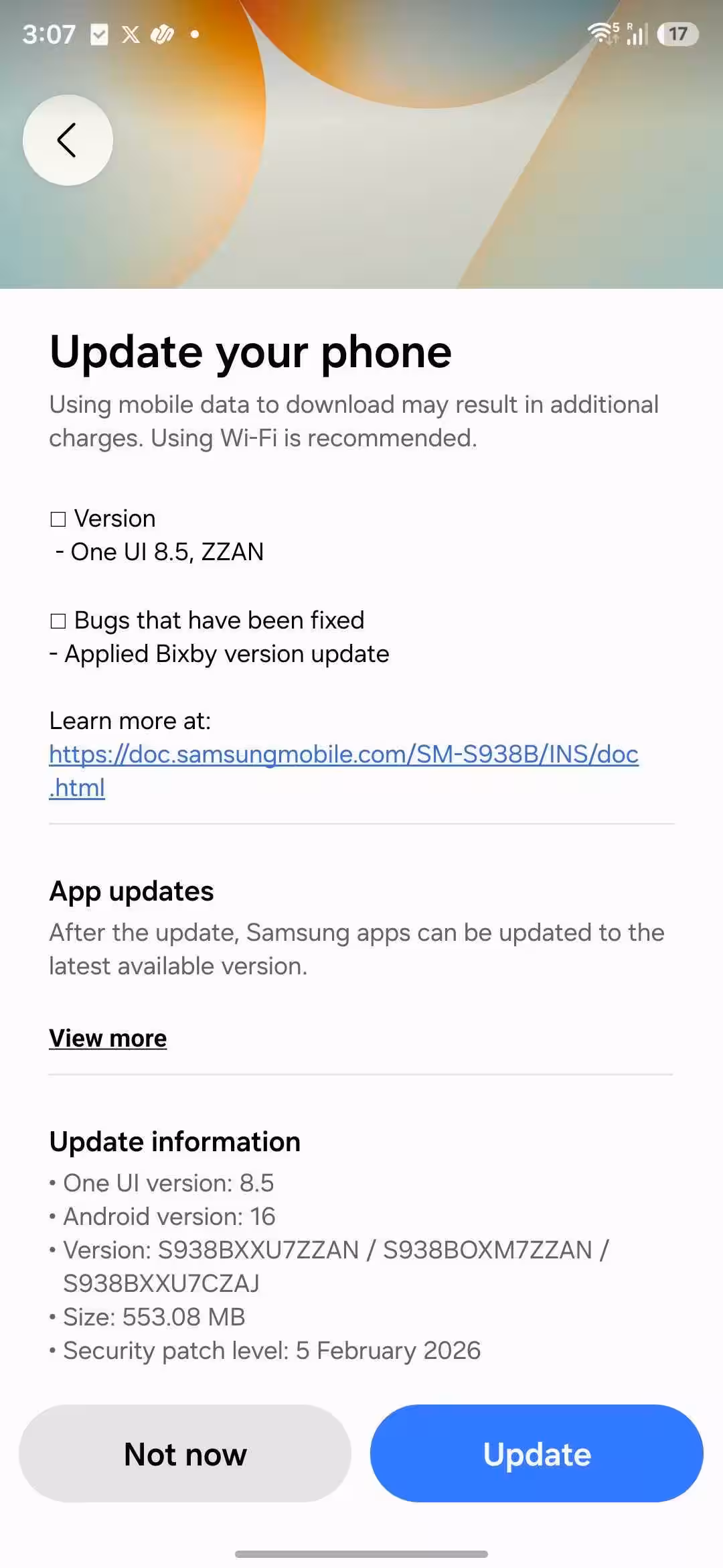 Патч занимает 553.08 МБ и, судя по официальному списку изменений, содержит одну строку: «Применено обновление версии Bixby.» Больше новых функций или исправлений в публичном ченджлоге не упомянуто.