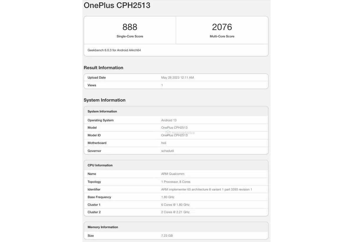 Прототип показал одноядерный результат 888 баллов и многоядерный — 2 076 баллов. Он работает на базе процессора Snapdragon 695, как и OnePlus Nord CE 3 Lite, и тоже под управлением Android 13. Устройство также имеет 8 ГБ оперативной памяти, как и Nord CE 3 Lite.