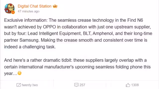 Find N6 представят в Китае 17 марта. В Oppo подчёркивают, что технология не является собственной разработкой — она создана в сотрудничестве нескольких крупных игроков индустрии: Samsung, Lead Intelligent Equipment, Amphenol и BLT. Объединённый опыт этих компаний позволил добиться минимальной глубины складки и высокой точности механизма сгиба.